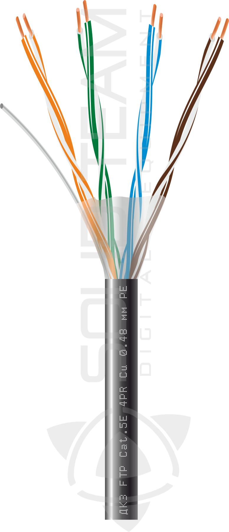- Кабель витої пари призначений для прокладки мережі поза приміщеннями. Складається з 4 пар, що проводить жила - мідний дріт, категорія Cat.5e, FTP - з захисним екраном.