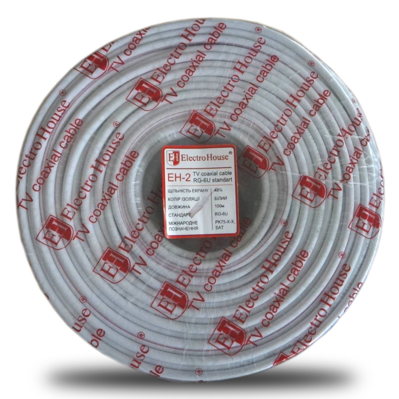 Кабель коаксіальний RG - 6U EH - 2 виділяється одночасно рядом переваг - це мала власна маса, вигідна вартість, висока якість передачі сигналу і хороша перешкодозахищеність. До того ж використовується для підключення тб - устаткування, або техніки, працюючих по методу прийняття сигналів. Складається з двох шнурів, що знаходяться на одній осі, екрану, накладеного на сердечник для більше кращого і якіснішого прийому. Покриттям виступає ПВХ білого кольору, що захищає від зовнішніх чинників тих, що впливають на кабель, в не залежності від місця установки, будь то усередині приміщення, або ж зовні. За рахунок усіх відмінних характеристик цей вид користується великою популярністю при виборі способу під’єднання.