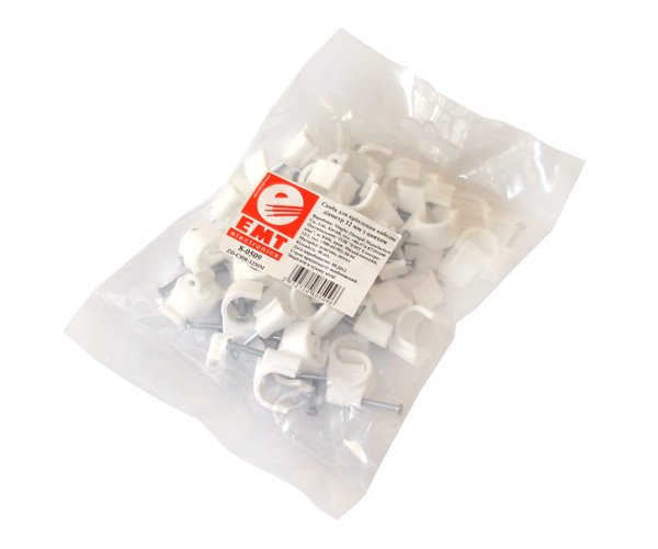 Скоба кругла з цвяхом. Діаметр 18 мм. В упаковці 50 шт. Застосовується для кріплення кабелю при прокладанні мереж.