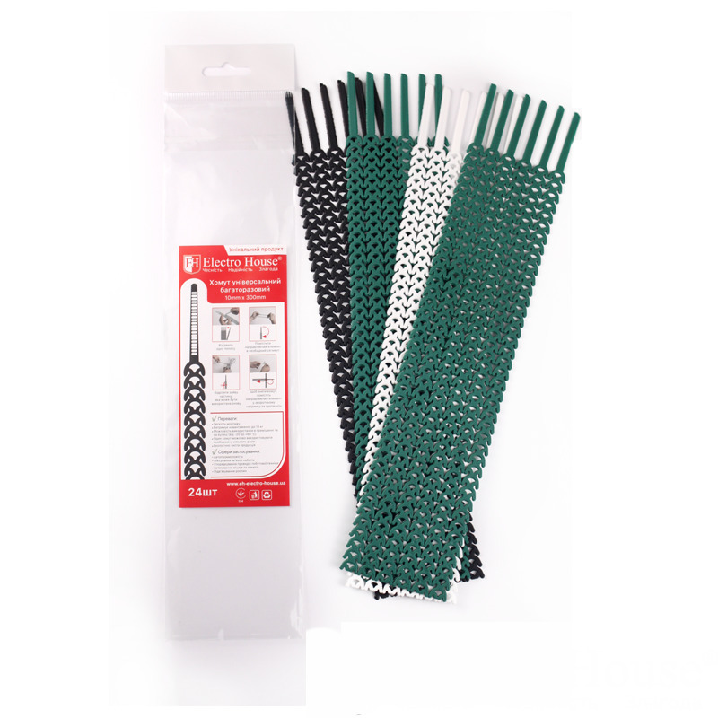 Хомут універсальний багаторазовий 10х300мм асорті від українського виробника ElectroHouse потрібний для багатократного застосування з метою зв'язування або фіксації дротів в пучки. Також його можна використати при електромонтажних роботах. Має особливу конструкцію, яка дозволяє кріпити його на певний оборот, при цьому замок надійно фіксується, але є можливість при необхідності швидко відокремити. Хомути бувають різноманітними кольорами: білим, зеленим, чорним. Виконані з високоміцних, термостійких і зносостійких матеріалів, які відповідають міжнародним вимогам за якістю. Може винести навантаження до 14 кг, вібрації, механічні удари, ультрафіолетове випромінювання, вологість, високі температури і інші зовнішні дії.