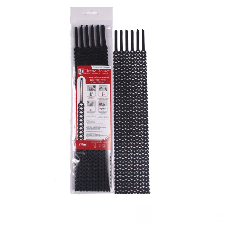 Хомут універсальний багаторазовий 10х300мм чорний від українського виробника ElectroHouse використовується як багатофункціональний виріб, який фіксує і зв'язує пучки дротів, а також застосовується при інших електромонтажних і слюсарних роботах. По конструктивних особливостях він дуже нагадує стягування кабельне, але на відміну від нього їм можна користуватися не один раз, що дуже зручно в деяких випадках. Зроблений з якісного, високоміцного і вогнетривкого матеріалу і має великий термін служби. Здатний витримувати підвищені температурні режими, вібрації, механічне навантаження, УФ-випромінення і т. д. Також він може винести вагу невеликих деталей до 14 кг. Виготовляється по нових технологіях згідно з вимогами міжнародних стандартів якості та безпеки продукції.