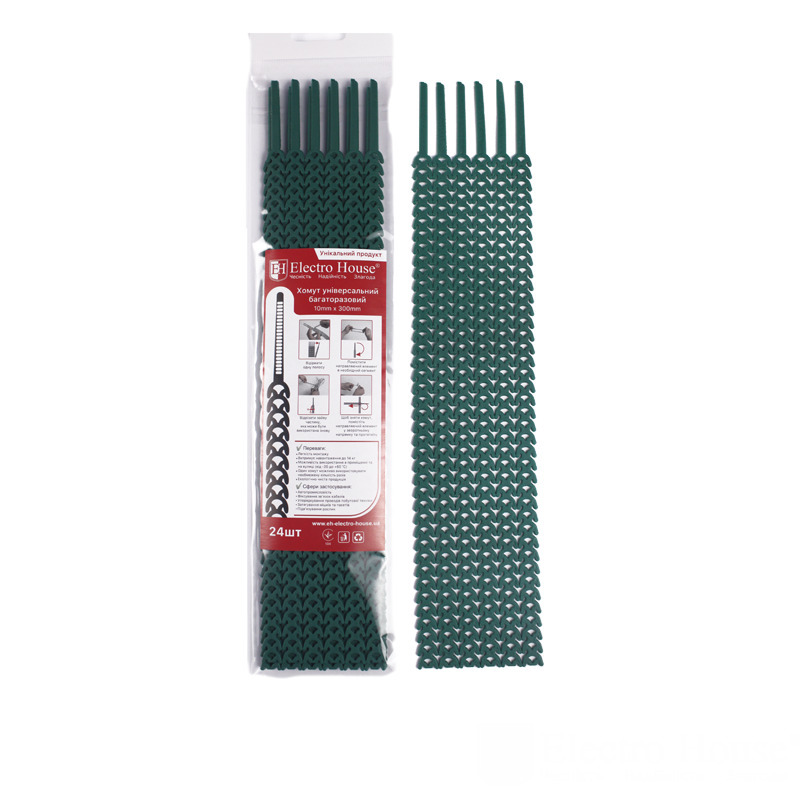 Хомут універсальний багаторазовий 10х300мм зелений від торгової марки ElectroHouse є незамінним багатофункціональним кріпильним виробом, який використовується для закріплення і зв'язування електропроводів і інших елементів при електромонтажних і слюсарних роботах. По конструкції схожий на просте кабельне стягування, але по своїх функціях він має неодноразове використання. Виготовлений з високоякісного, міцного, вогнетривкого і зносостійкого пластика, тому може витримати дуже високі температурні режими, різні механічні, вібраційні навантаження, ультрафіолетові випромінювання і т. д. Він також здатний переносити вагу деталей до 14 кг. Роблять його відповідно до міжнародних норм якості та безпеки продукції.