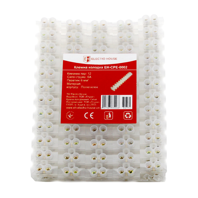Рекомендуємо Вам розглянути клемну колодку 6A 6mm2 ПЭ EH - CPE - 0002 від торгової марки ElectroHouse. Вона призначена для з'єднання різних дротів між собою. По конструкції клемний блок має дванадцять пар електроконтактів з латуні, які поміщені в діелектричний поліетиленовий корпус. Кожна з цих контактних пар може відділятися і використовуватися окремо. По своїх розмірах термінал компактний і може використовуватися при монтажних роботах в різних розподільних коробках. Для того, щоб з його допомогою з'єднати електропроводи, треба з двох сторін завести їх струмопровідні жили і затиснути їх гвинтовим з'єднанням. В умовах експлуатації цей виріб переносить багато впливів довкілля : перепади температур, вібрації, ультрафіолетові випромінювання і т. д.
