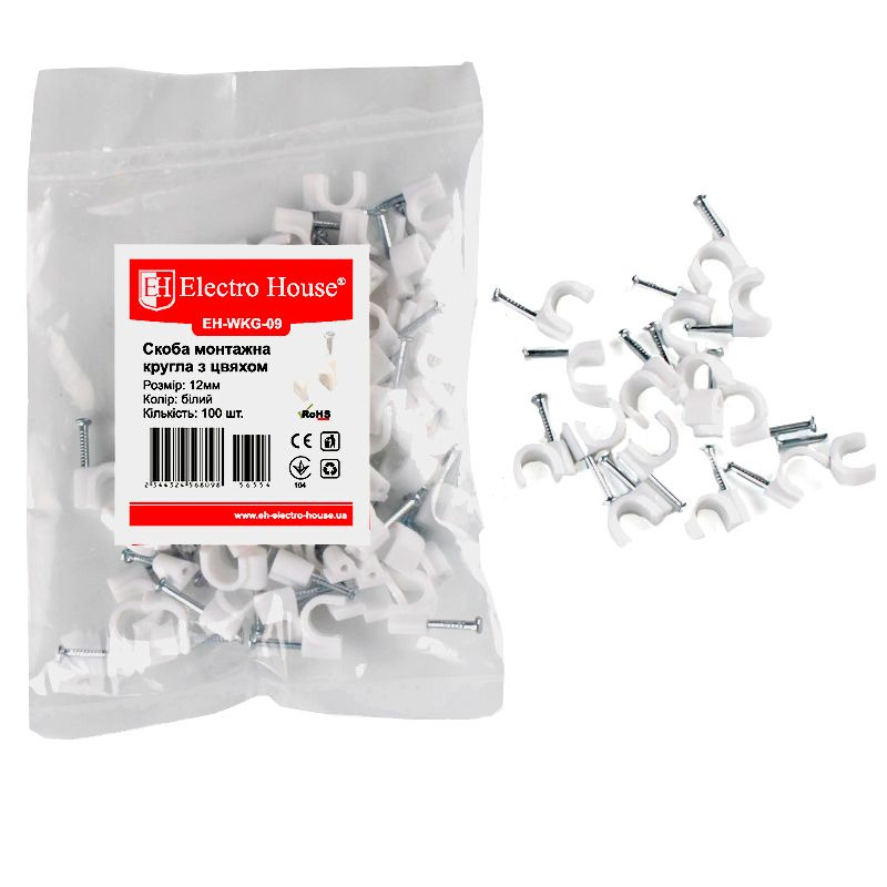 Кліпса з цвяхом 12 мм EH - WKG - 09 від виробника високоякісних електротоварів ElectroHouse застосовується для виконання зовнішніх монтажних робіт при прокладенні круглих електропроводів. Її дуже комфортно застосовувати у тому випадку, коли вам треба закріпити дріт до якої-небудь прямої площини, приміром до стіни або стелі і т. д. Кріпиться вона за допомогою укомплектованого в ній цвяха, який виготовлений з міцної покритої цинком сталі. Півкільце, в яке вкладається кабель робиться із дуже міцної, пластмаси, що не згорає і зносостійкої. Володіє захисними характеристиками від впливів корозійних процесів і від пожежонебезпечних ситуацій. В умовах експлуатації вважається стійким і довготривалим продуктом.