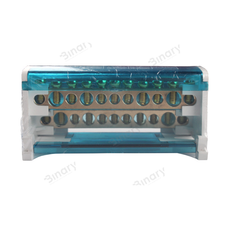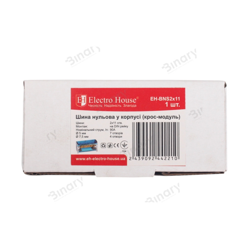 Шина нульова в корпусі (крос-модуль) EH-BNS2X11 від компанії "Electro House" призначена для електричного і механічного з'єднання нульових, захисних і фазних провідників. Вона має корпус з термостійкого самозатухаючого пластику в якому розміщені нульові шини ізольовані один від одного перегородками і відкидну кришку з прозорого пластику, яка дозволяє візуально контролювати якість з'єднання дротів, а так само запобігає випадковому попаданню сторонніх предметів. Так само кришка дає захист від випадкового дотику до струмоведучих частин модуля. Шини виготовлені з електротехнічної латуні. Крос-модуль має сучасний естетичний вигляд і компактні розміри. Завдяки використанню цього пристрою розводка кабелів в електрощиті або електрошафі стане не лише безпечнішою і компактнішою, але і набуде естетичнішого вигляду. Завдяки наочності розподілу кабелів, яку дає крос-модуль, ремонтні або монтажні роботи займатимуть значно менше часу. Шина нульова в корпусі має кріплення для установки на DIN рейку, що дозволяє її встановити впродовж декількох секунд. Дроти фіксуються в нульовій шині за допомогою гвинтів, що робить з'єднання надійним і дозволяє використати цей пристрій багатократно. Завдяки конструктивним особливостям крос-модуль можна використати і як перехідний клемник для кабелю більшого перерізу якщо необхідно підключити декілька кабелів меншого перерізу, що практично і зручно. Ця модель крос-модуля складається з двох нульових шин, кожна з яких містить по одинадцять кабельних виводів. Діаметр кабельних виводів : 2х 8,5 мм, 2х7,5 і 7х6 мм для кожної шини. Її номінальний струм - 125А. Робоча температура для цього виробу від - 40 до 50оС при середньому значенні відносної вологості не більше 90%. Переріз провідників 2,5 – 16 мм2, що підключаються . Має клас захисту IP20. Для тривалої і надійної експлуатації нульової шини навколишнє повітря не має бути засмічене парами солей, корозійними або запалюючими газами.