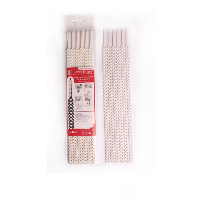 Хомут универсальный многоразовый 10х300мм белый от фирмы ElectroHouse нужен в качестве крепежа, который употребляется часто при связке проводов в пучки, а еще при всевозможных электромонтажных или слесарных работах. По собственной конструкции он похож на обыкновенный кабельный бандаж, но владеет основной характерной индивидуальностью - он имеет возможность много раз использоваться. Материал, из которого он сделан, обладает очень прочными, износостойкими и огнеупорными свойствами. Переносит он довольно высочайшие температуры, вибрации, УФ-излучения и механические нагрузки. Он может выдержать груз весом до 14 килограммов. Исполнен в соответствии с международными потребностями по качеству и безопасности. Купить этот хомут универсальный многоразовый от изготовителя ElectroHouse вы сможете у нас на веб-сайте по наиболее доступной и приятной для вас цене.