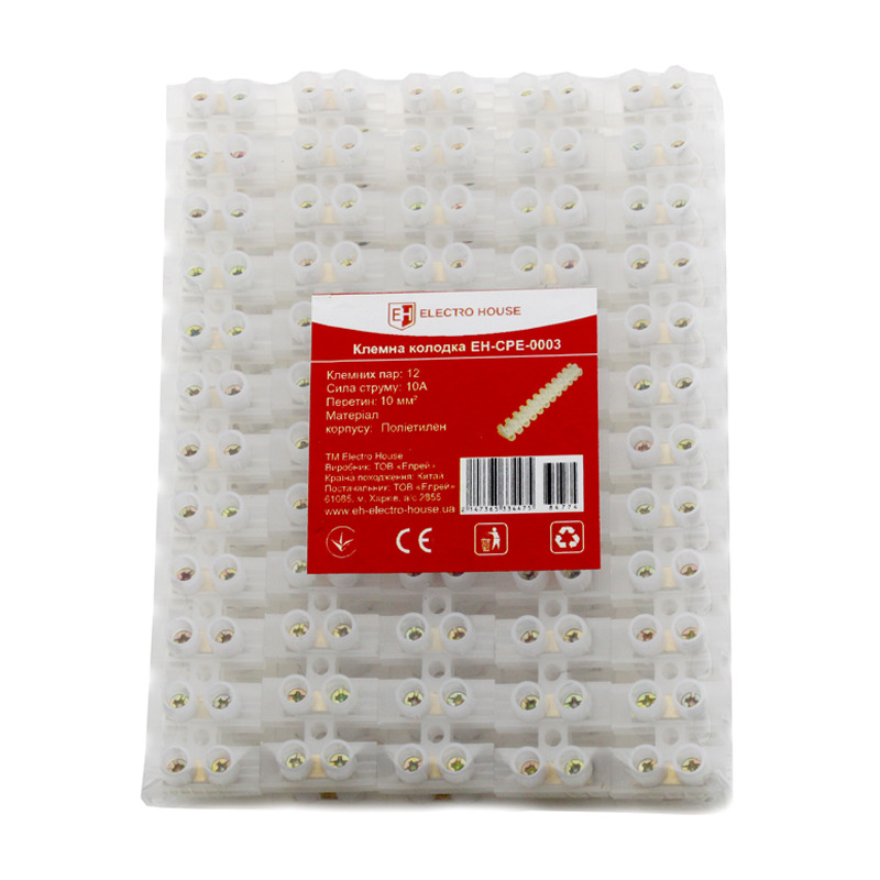 Клеммная колодка 10A 10mm2 ПЭ EH-CPE-0003 от производителя высококачественной электромонтажной продукции ElectroHouse включает в себя двенадцать контактных пар, при помощи которых можно соединять между собой электропровода из алюминия и меди. Часто используют для присоединения проводов в распределительной коробке для прокладки электросети, для подключения к осветительным приборам, выключателям, розеткам и т. д. Изолирована огнестойким, высокопрочным и морозоустойчивым полиэтиленом, внутри которого находятся латунные электроконтакты, и винты, которыми они прижимаются с определенным усилием. Достаточно устойчивая при воздействии внешних влияний: щелочи, растворителей, масла, ультрафиолетовых излучений и перепадов температурных режимов и т. д. Клеммная колодка 10A 10mm2 ПЭ EH-CPE-0003 от украинского производителя ElectroHouse считается более надежным соединителем электрокабелей при выполнении быстрого монтажа.