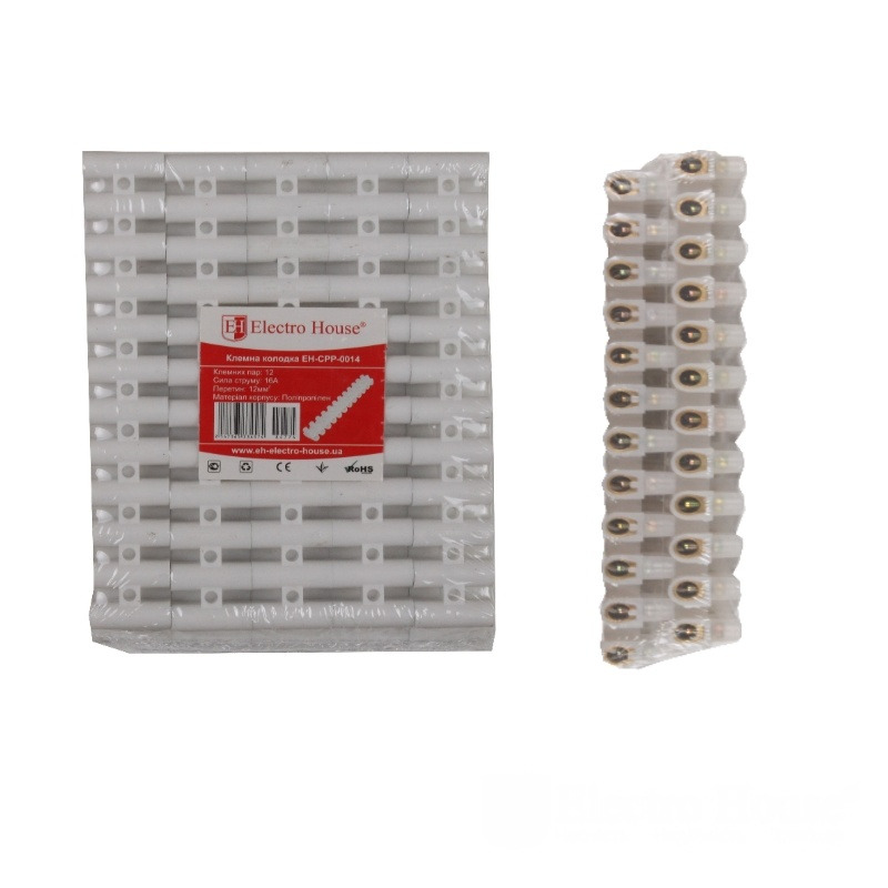 Клеммная колодка 15A 12mm² Полипропилен EH-CPP-0014n является простым и надежным электротехническим изделием, которое используется при электромонтажных работах, связанных с прокладкой электропроводки или при подключении осветительного и другого электрооборудования. Она позволяет соединять между собой электропровода из различных металлов - алюминия и меди. По конструктивным особенностям терминал состоит из двенадцати пар электроконтактов из латуни, которые сверху покрыты огнеупорной и прочной оболочкой. Каждую пару контактов можно отделить и использовать отдельно. Клеммный блок легко помещается в распределительный шкаф или монтажную коробку. Для того, чтобы с их помощью соединить провода, надо их токопроводящие жилы завести с обеих сторон в клемму и зажать винтами. В эксплуатации отличается высокой износостойкостью и долговечностью.