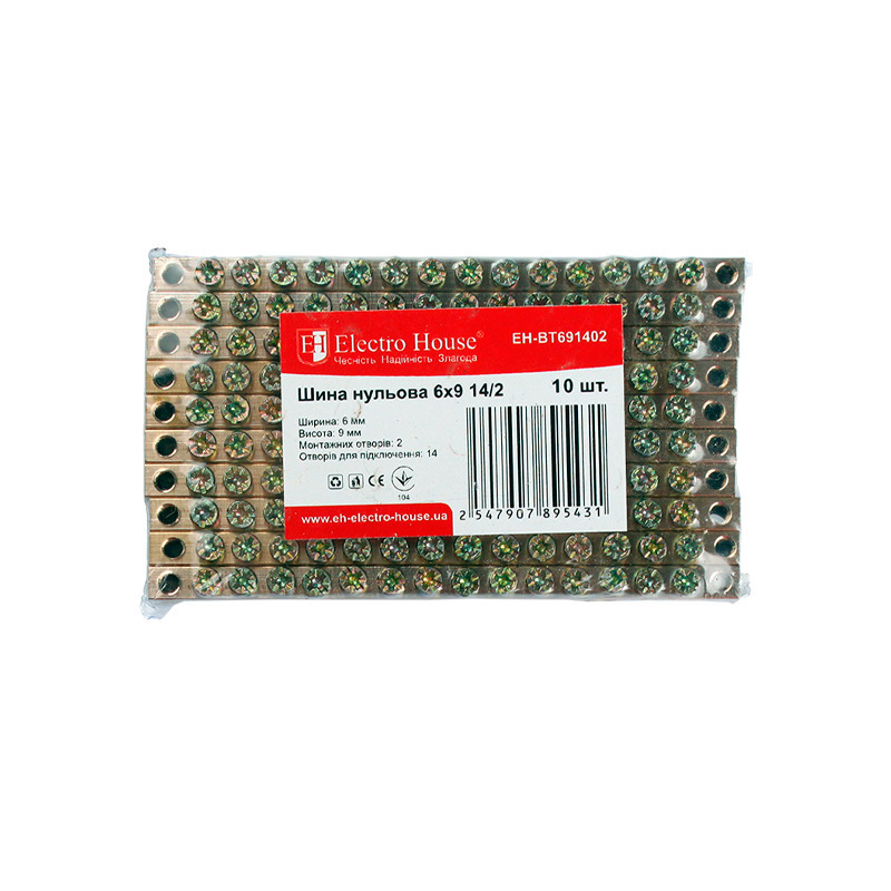 Шина нулевая 6х9 14/2 EH-BT691402 от компании "ElectroHouse" предназначена для электрического и механического соединения нулевых, защитных и фазных проводников. Она имеет два отверстия для установки расположенные по краям шины. Устанавливается на изолятор. Это изделие отличается высоким качеством, надежностью и долговечностью. Соответствует мировым и европейским стандартам качества.На сегодняшний день просто невозможно представить сборку электрощита без применения подобных устройств. Ведь использование этого изделия существенно облегчит работу электриков и сделает ее более безопасной. Если раньше надежная и безотказная работа УЗО обеспечивалась установкой отдельно взятых нулевых шин к каждому отдельно взятому устройству защитного отключения, то теперь можно подвести общий нулевой провод к шине и уже с нее развести от созданного таким образом блока к прочим составным частям созданной системы. Благодаря этому повышается надежность и безопасность всей системы в целом.Конструктивно эта модель представляет собой токопроводящую жилу без изоляции. Токопроводящая жила изготовлена из электротехнической латуни и содержит в себе отверстия с зажимными винтами для крепления в ней проводников (14 кабельных выводов) и имеет длину 102 мм, ширину 6 мм и высоту 9 мм . Диаметр отверстий для монтажа проводников 5 мм.Номинальное напряжение для этой модели - 400В. Номинальный ток - 100А. Рабочая температура для этого изделия от -40 до 50оС при среднем значении относительной влажности не более 90%. Для длительной и надежной эксплуатации окружающий воздух не должен быть засорен парами солей, коррозионными или воспламеняющими газами. Для обеспечения качественного соединения, а также упрощения дальнейшего обслуживания, шина выполнена единым токопроводящим элементом. Ее монтаж прост и не занимает много времени.
