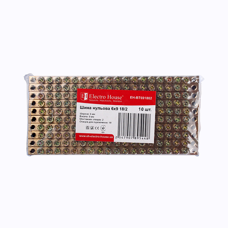 Шина нулевая 6х9 18/2 EH-BT691802 от компании "ElectroHouse" предназначена для электрического и механического соединения нулевых, защитных и фазных проводников. Она имеет два отверстия для установки расположенные по краям шины. Устанавливается на изолятор. Это изделие отличается высоким качеством, надежностью и долговечностью. Соответствует мировым и европейским стандартам качества.На сегодняшний день просто невозможно представить сборку электрощита без применения подобных устройств. Ведь использование этого изделия существенно облегчит работу электриков и сделает ее более безопасной. Если раньше надежная и безотказная работа УЗО обеспечивалась установкой отдельно взятых нулевых шин к каждому отдельно взятому устройству защитного отключения, то теперь можно подвести общий нулевой провод к шине и уже с нее развести от созданного таким образом блока к прочим составным частям созданной системы. Благодаря этому повышается надежность и безопасность всей системы в целом.Конструктивно эта модель представляет собой токопроводящую жилу без изоляции. Токопроводящая жила изготовлена из электротехнической латуни и содержит в себе отверстия с зажимными винтами для крепления в ней проводников (18 кабельных выводов) и имеет длину 126 мм, ширину 6 мм и высоту 9 мм . Диаметр отверстий для монтажа проводников 5 мм.Номинальное напряжение для этой модели - 400В. Номинальный ток - 100А. Рабочая температура для этого изделия от -40 до 50оС при среднем значении относительной влажности не более 90%. Для длительной и надежной эксплуатации окружающий воздух не должен быть засорен парами солей, коррозионными или воспламеняющими газами. Для обеспечения качественного соединения, а также упрощения дальнейшего обслуживания, шина выполнена единым токопроводящим элементом. Ее монтаж прост и не занимает много времени.