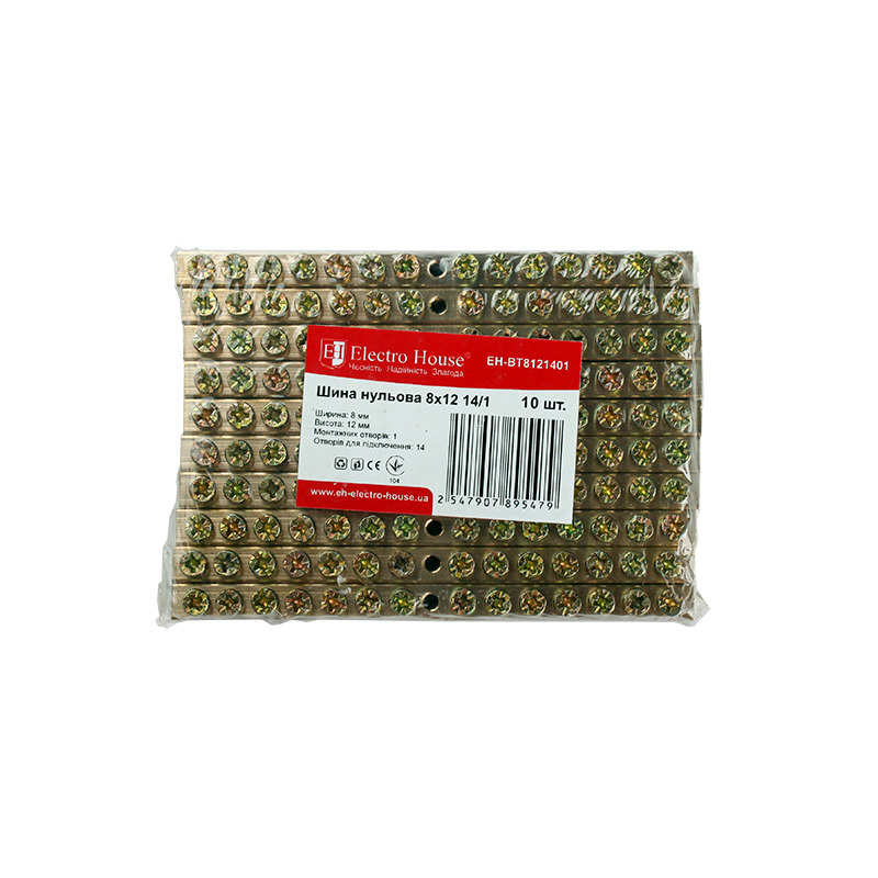 Шина нулевая 8х12 14/1 EH-BT8121401 от компании "ElectroHouse" предназначена для электрического и механического соединения нулевых, защитных и фазных проводников. Она имеет одно отверстие для установки расположенное по центру шины. Устанавливается на изолятор. Это изделие отличается высоким качеством, надежностью и долговечностью. Соответствует мировым и европейским стандартам качества.На сегодняшний день просто невозможно представить сборку электрощита без применения подобных устройств. Ведь использование этого изделия существенно облегчит работу электриков и сделает ее более безопасной. Если раньше надежная и безотказная работа УЗО обеспечивалась установкой отдельно взятых нулевых шин к каждому отдельно взятому устройству защитного отключения, то теперь можно подвести общий нулевой провод к шине и уже с нее развести от созданного таким образом блока к прочим составным частям созданной системы. Благодаря этому повышается надежность и безопасность всей системы в целом.Конструктивно эта модель представляет собой токопроводящую жилу без изоляции. Токопроводящая жила изготовлена из электротехнической латуни и содержит в себе отверстия с зажимными винтами для крепления в ней проводников (14 кабельных выводов) и имеет длину 117 мм, ширину 8 мм и высоту 12 мм . Диаметр отверстий для монтажа проводников 6 мм. Номинальное напряжение для этой модели - 400В. Номинальный ток - 125А. Рабочая температура для этого изделия - от -40 до 50оС при среднем значении относительной влажности не более 90%. Для длительной и надежной эксплуатации окружающий воздух не должен быть засорен парами солей, коррозионными или воспламеняющими газами. Для обеспечения качественного соединения, а также упрощения дальнейшего обслуживания, шина выполнена единым токопроводящим элементом. Ее монтаж прост и не занимает много времени.