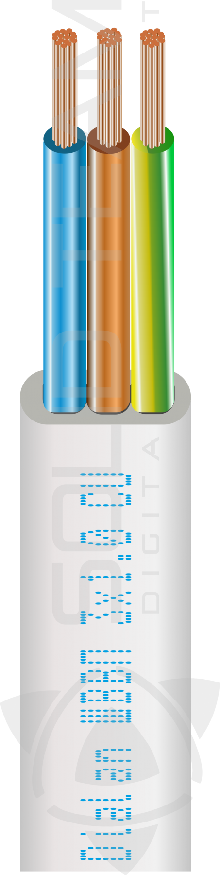 Данный кабель трехжильный , медные жилы состоят из переплетенных проволочек,диаметром в 0,19 мм. Они уложены в один горизонтальный ряд и покрыты разноцветной ПВХ изоляцией, толщина которой от 0,55 до 0,7мм.