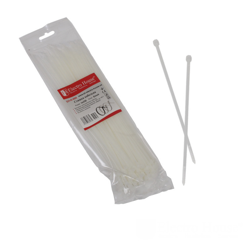 Стяжка кабельная белая 3.6×250 EH-K-004 от производителя ElectroHouse выполнена в виде стяжной ленты, которая имеет прямое предназначение - стягивание и связывание электропроводов в пучки. Является полезным электротехническим изделием для многих электромонтажных работ, в особенности при прокладывании электрокабельных магистралей. Также хомут пластиковый возможно использовать и для других целей, в том числе и для маркировки различных изделий. Часто она незаменима на производстве, в быту, хозяйстве и прочих сферах. Сделан хомут стяжной из нейлона, который характеризуется гибкими, износостойкими и противопожарными свойствами. Выдерживает высокие и низкие температуры, влияние вибраций и механических нагрузок и так далее. Ее возможно применять на улице, так как она переносит атмосферные осадки.