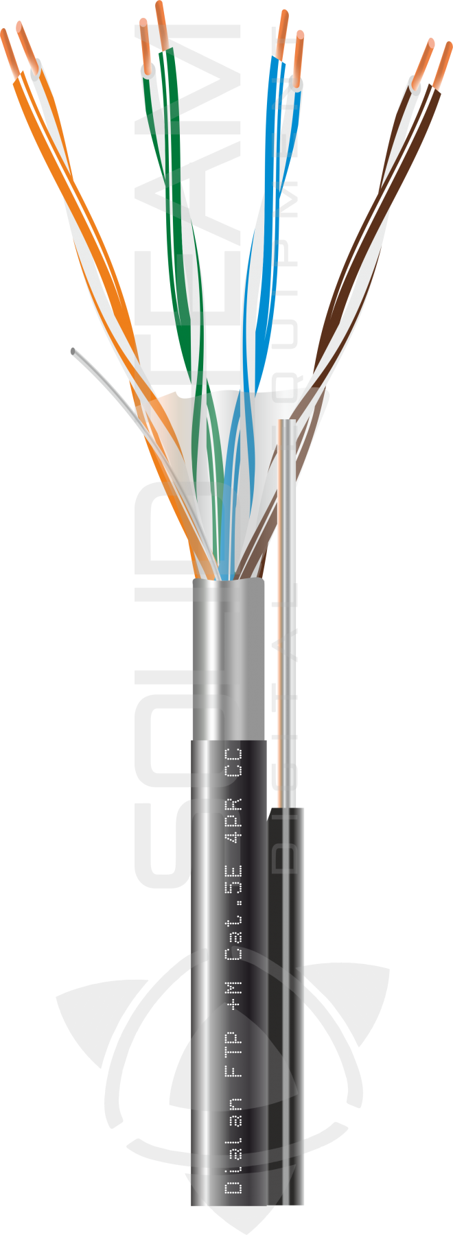 Дополнительный силовой элемент - металлический дрит- обеспечит усиленную стойкость кабеля к механическим нагрузкам или резких порывов ветра. Провод идет параллельно с проводниками, он покрыт отдельной оболочкой. Экран с алюмополимернои фольги.