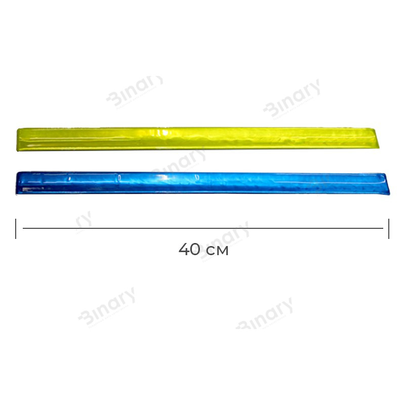 Світловідбиваюча стрічка жовта і синя – це комплект з двох самозастібних стрічок-браслетів. Один виріб блакитного кольору, інший - жовтого. Основне призначення світловідбиваючої стрічки - це підвищення безпеки в темний час доби або при поганій видимості (похмура погода, туман). Така стрічка має високу світловідбиваючу здатність і добре видно якщо на неї падає навіть неяскраве світло. В умовах поганої освітленості або при відсутності освітлення дозволяє водієві помітити предмет з дальньої відстані і уникнути зіткнення. При поганому освітленні водій здатний помітити пішохода на відстані не більше ніж 50 метрів, а світловідбиваюча стрічка збільшує цю відстань приблизно до 250 метрів. Стрічка виготовлена зі світловідбиваючого ПВХ і листа високоеластичної кремнієвої сталі, її довжина 40 см і ширина 3 см.Такі стрічки не тільки підвищують безпеку пішохода або велосипедиста при поганій видимості, але і є оригінальним аксесуаром завдяки яскравим насиченим кольорам.